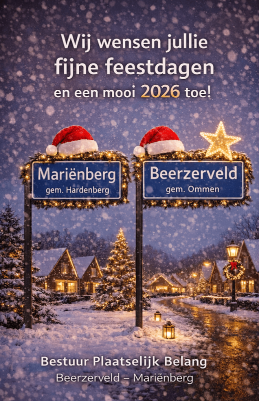 Het Bestuur Plaatselijk Belang Beerzerveld/Mariënberg wenst u en uwen fijne feestdagen en een mooi en voorspoedig 2026 toe.