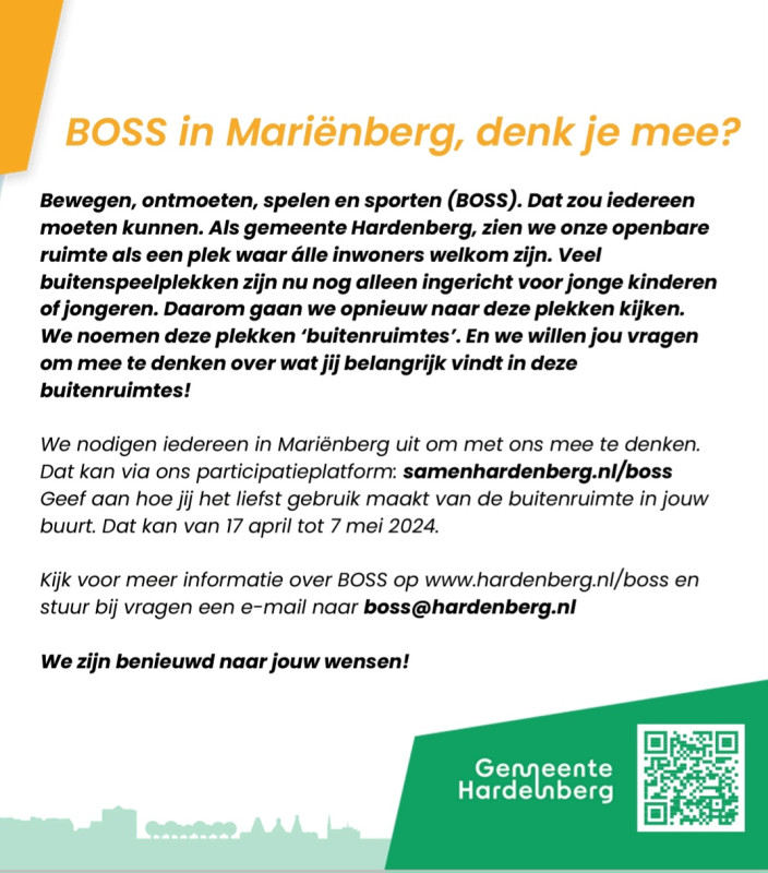 "Bewegen, ontmoeten, spelen en sporten (BOSS). Dat zou iedereen moeten kunnen. Als gemeente Hardenberg, zien we onze openbare ruimte als een plek waar álle inwoners welkom zijn. Veel buitenspeelplekken zijn nu nog alleen ingericht voor jonge kinderen of jongeren. Daarom gaan we opnieuw naar deze plekken kijken. We noemen deze plekken ‘buitenruimtes’."